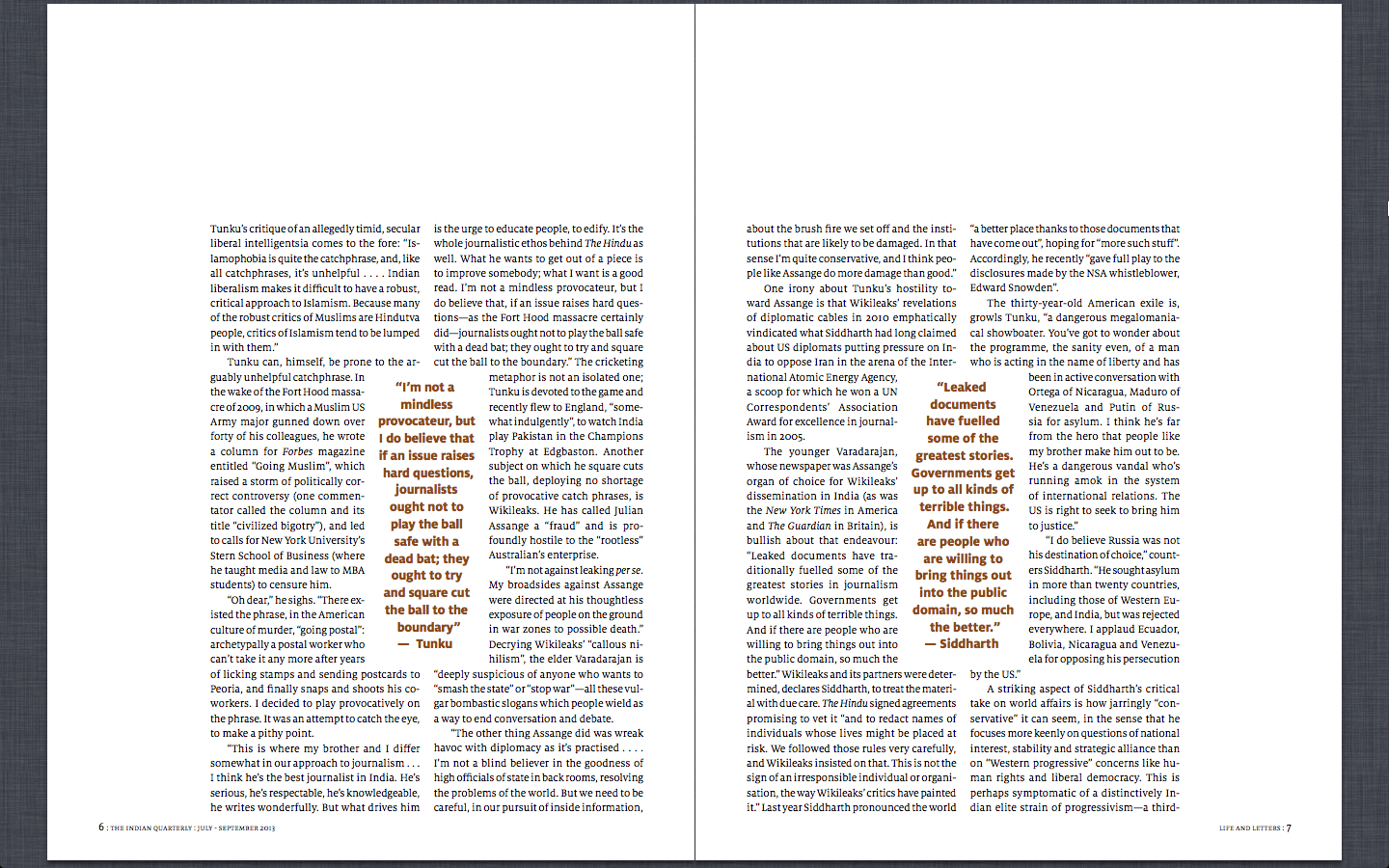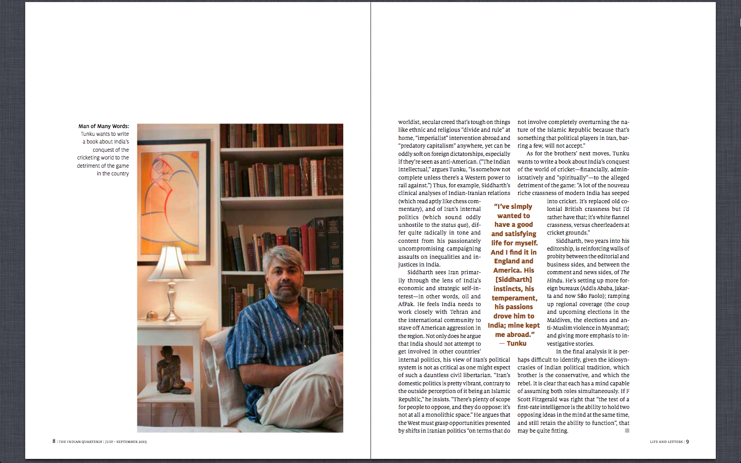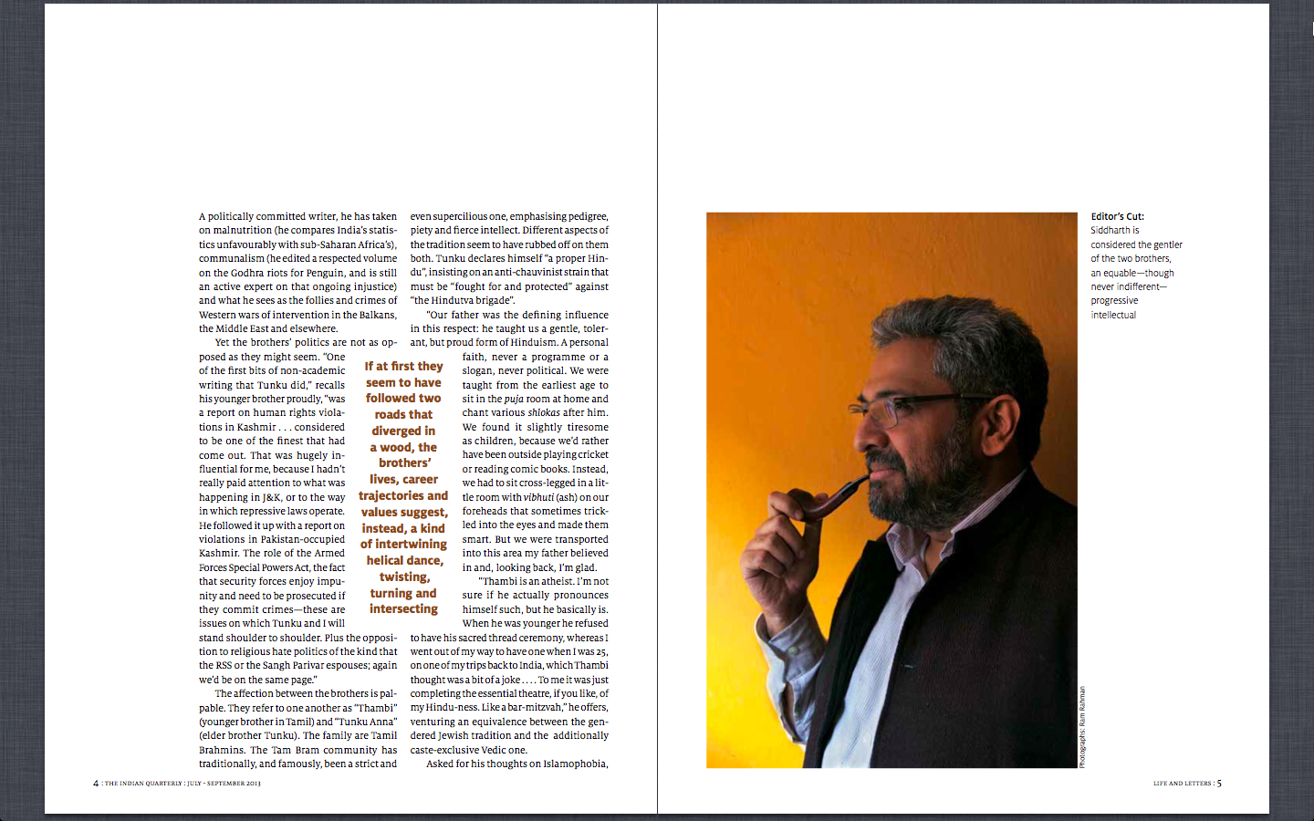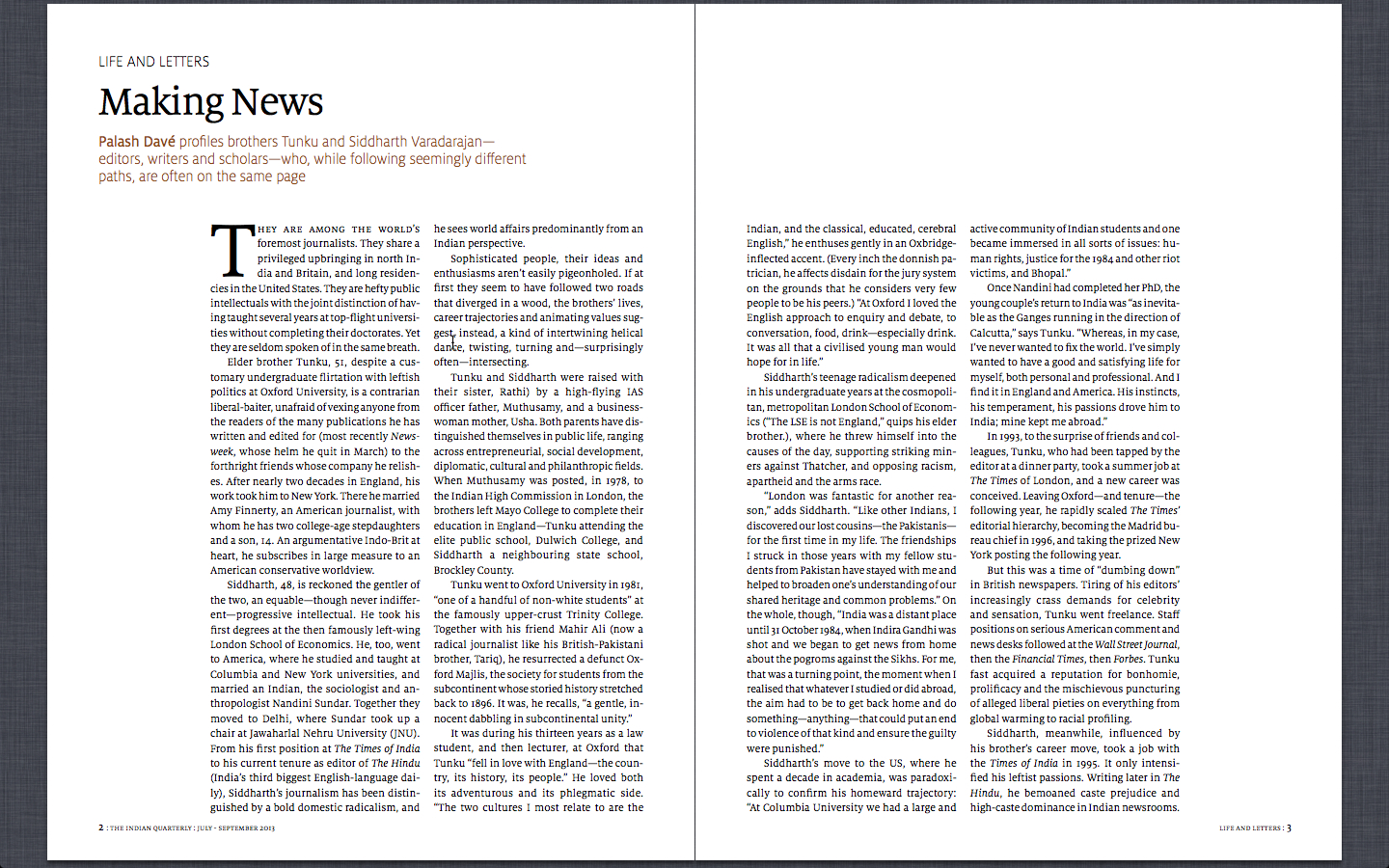 Palash Davé profiles brothers Tunku and Siddharth Varadarajan— editors, writers and scholars—who, while following seemingly different paths, are often on the same page From:THE INDIAN QUARTERLY, JULY-SEPTEMBER 2013