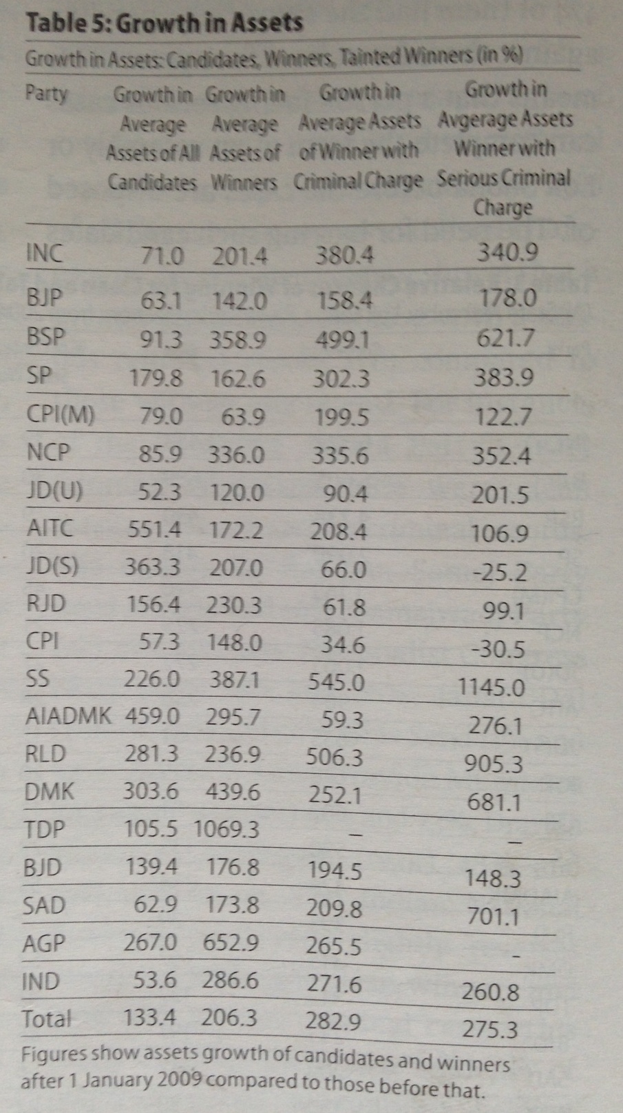 The table below on the growth of assets of the 3,542 candidates who contested more than one election is also very illuminating. “For winners, the average assets went up from Rs 1.8 crore [in 2004] to Rs 5.81 crore [in 2013], an increase of 222 per cent. Winners are able to increase their wealth much faster than other candidates.”