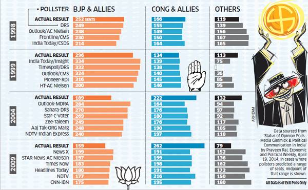 A month and five days after it began, voting for India’s general election is finally over and the exit poll numbers are rolling in. Based on previous experience, however, there is no reason to assume surveys are particularly accurate. In 2004 and 2009, all exit polls got the results completely wrong, overestimating the Bharatiya Janata Party and National Democratic Alliance’s seat share by around 15-30 per cent.